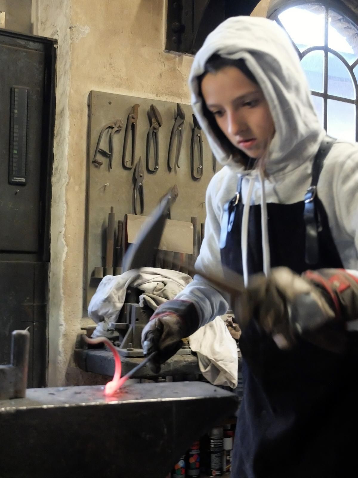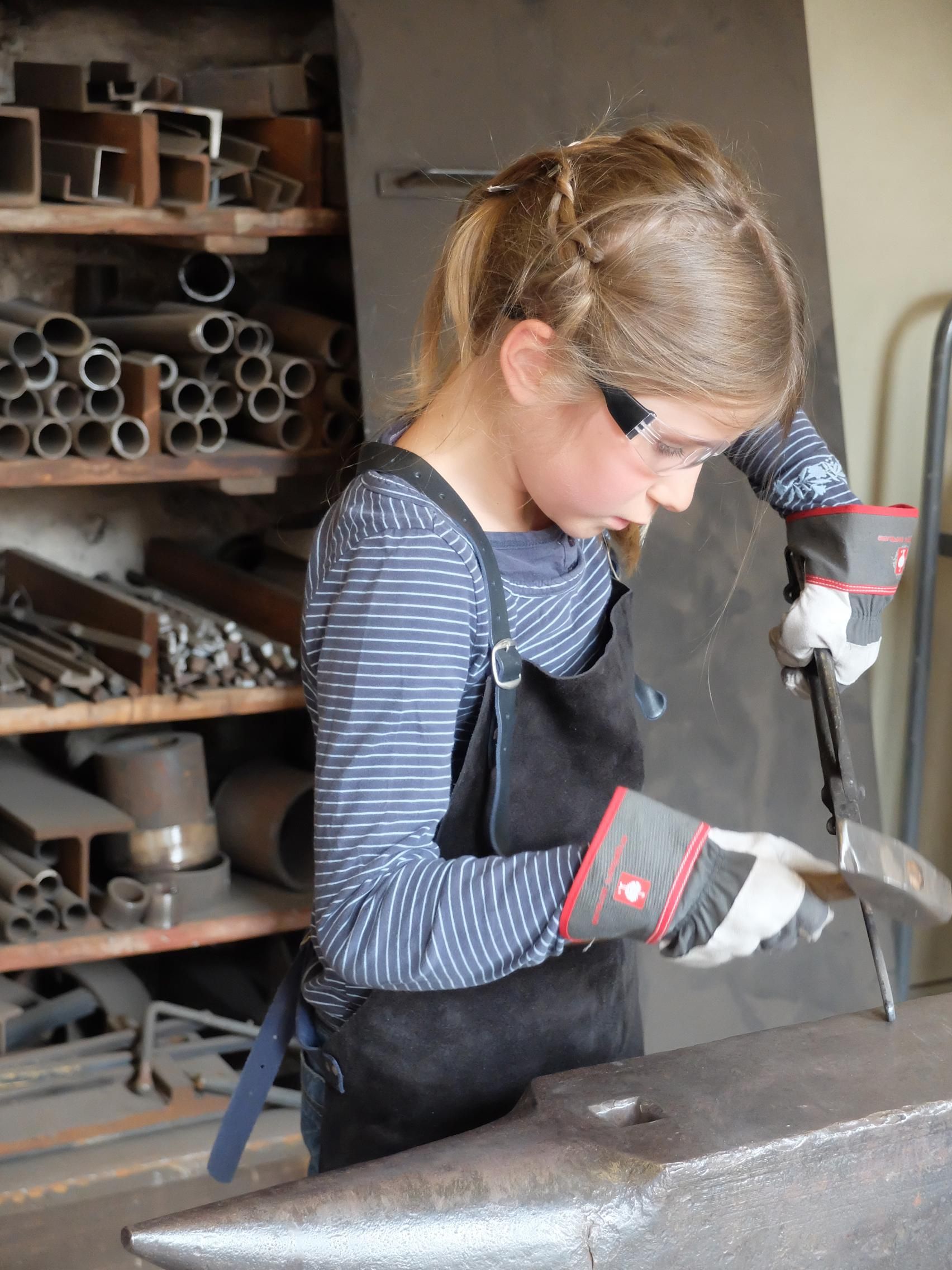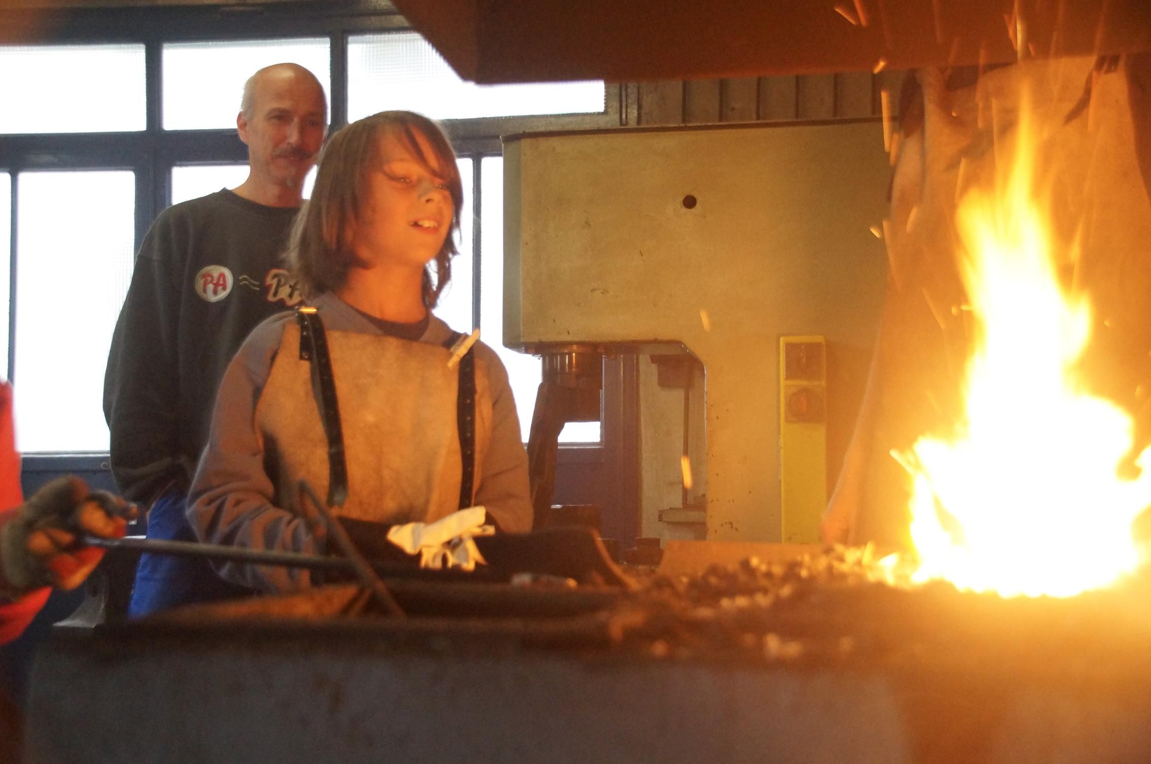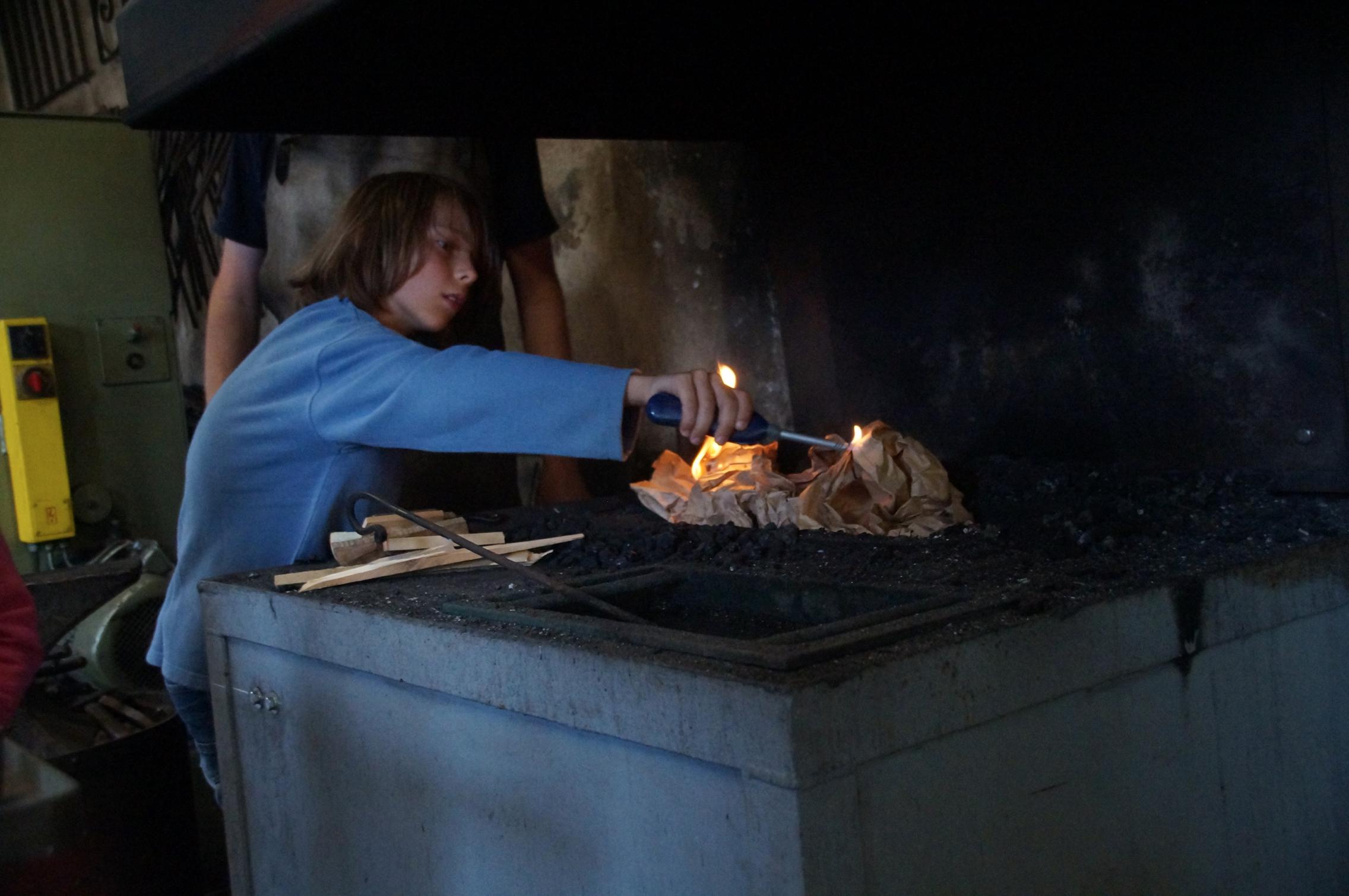 Ich erlebe immer wieder, dass Kinder magisch angezogen werden vom Feuer und Rauch, dem Ping Ping des Hammers auf dem Ambos und nicht zuletzt vom glühenden Eisen, das unter den Hammerschlägen zur Schnecke, zum Herz oder zum Wikingermesser wird. Leuchtende Augen und dann kommt die Frage: „Darf ich auch einmal auf das Eisen hämmern?“ Ja, ihr dürft!!