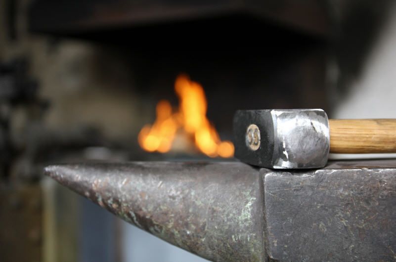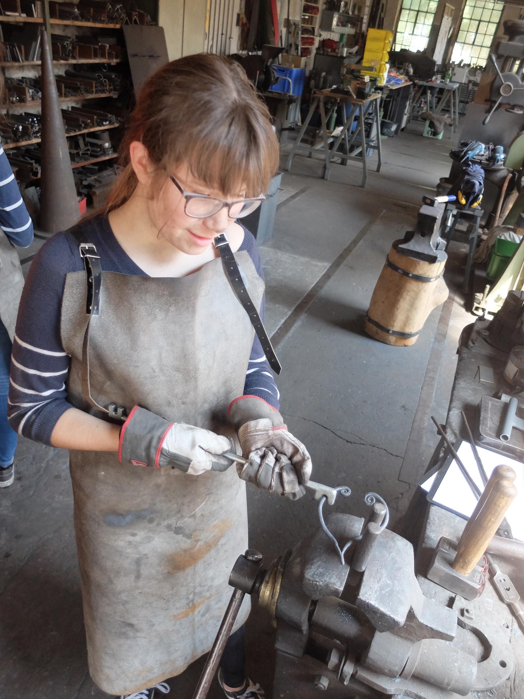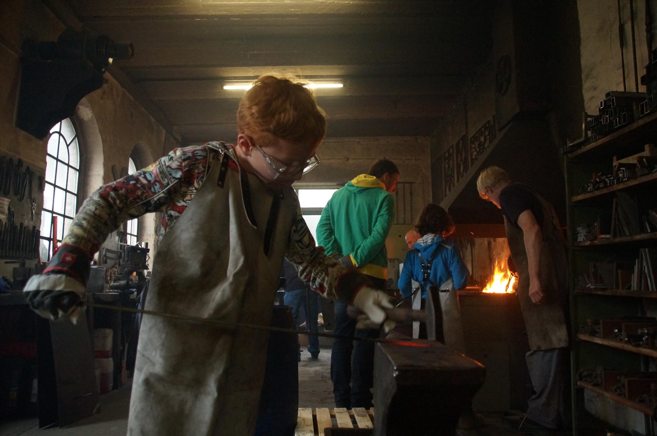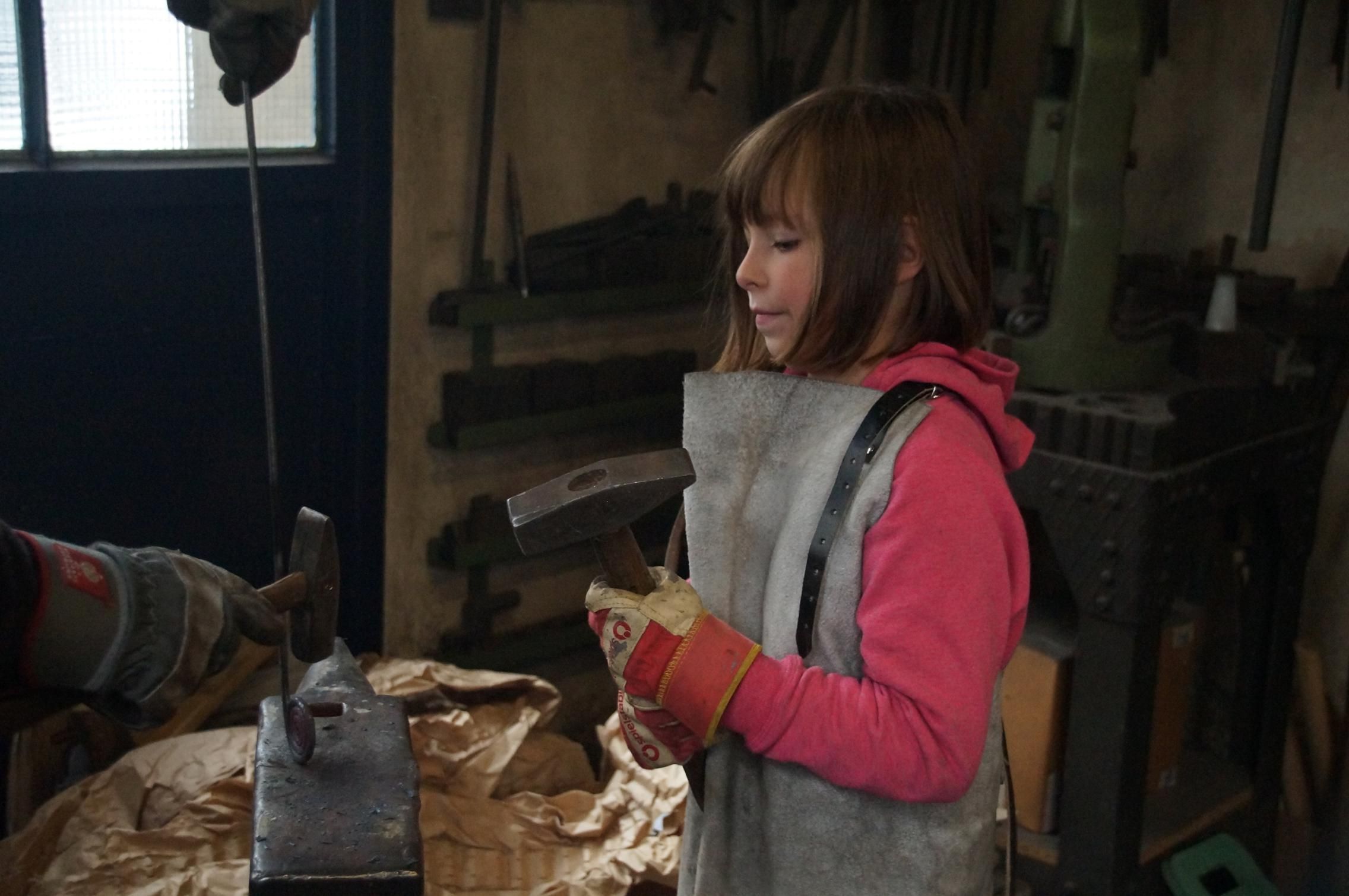 Ich erlebe immer wieder, dass Kinder magisch angezogen werden vom Feuer und Rauch, dem Ping Ping des Hammers auf dem Ambos und nicht zuletzt vom glühenden Eisen, das unter den Hammerschlägen zur Schnecke, zum Herz oder zum Wikingermesser wird. Leuchtende Augen und dann kommt die Frage: „Darf ich auch einmal auf das Eisen hämmern?“ Ja, ihr dürft!!