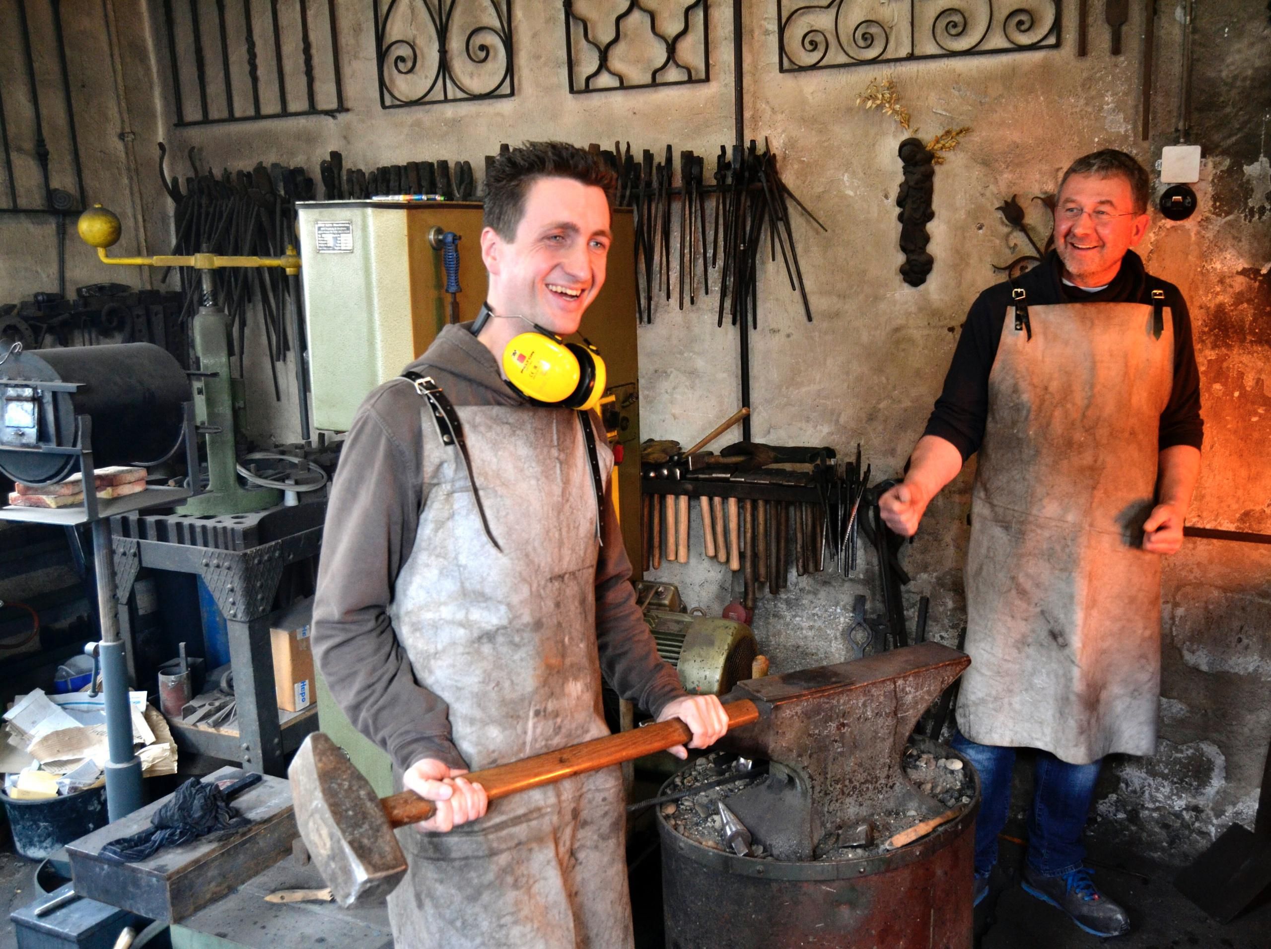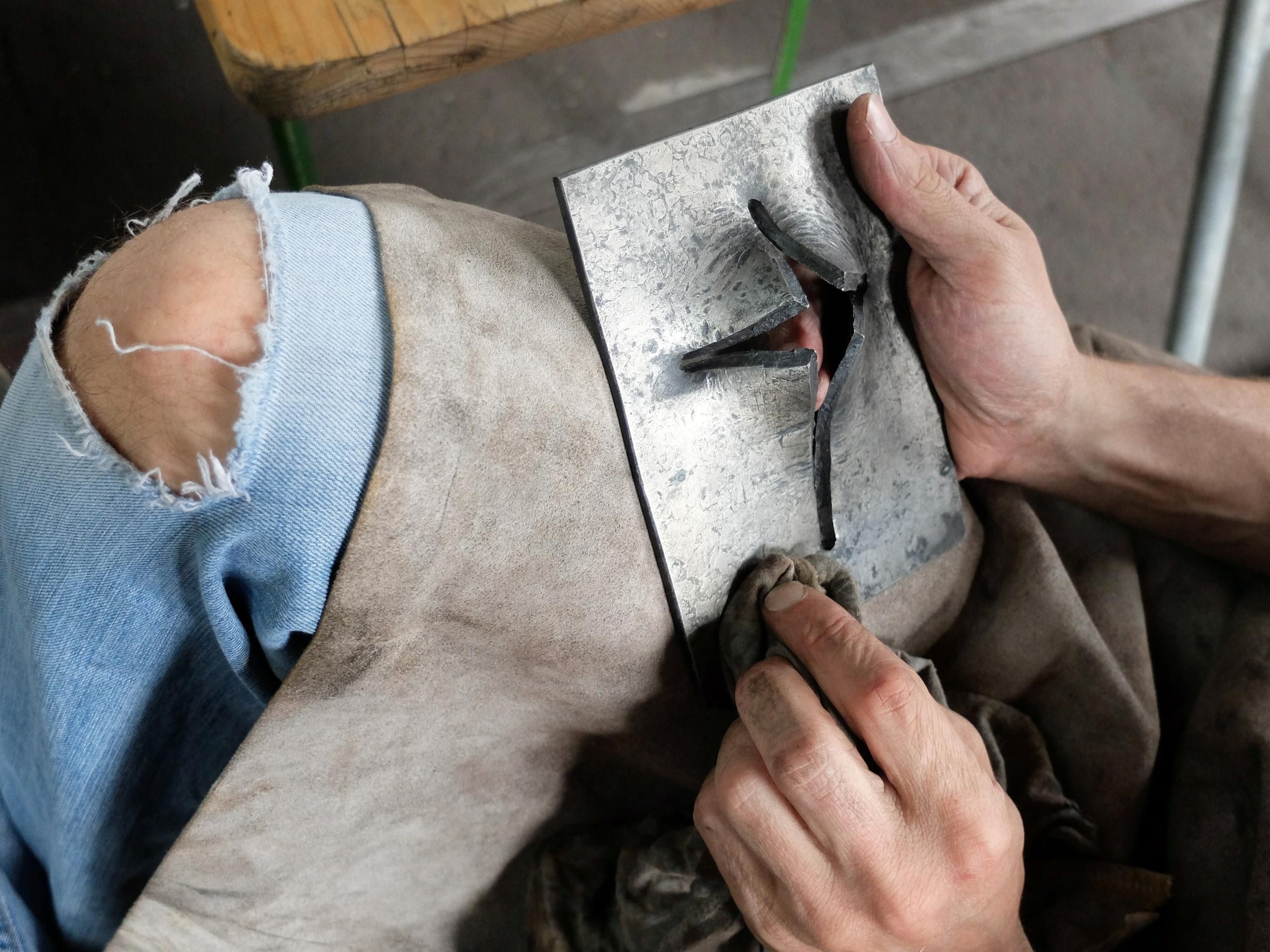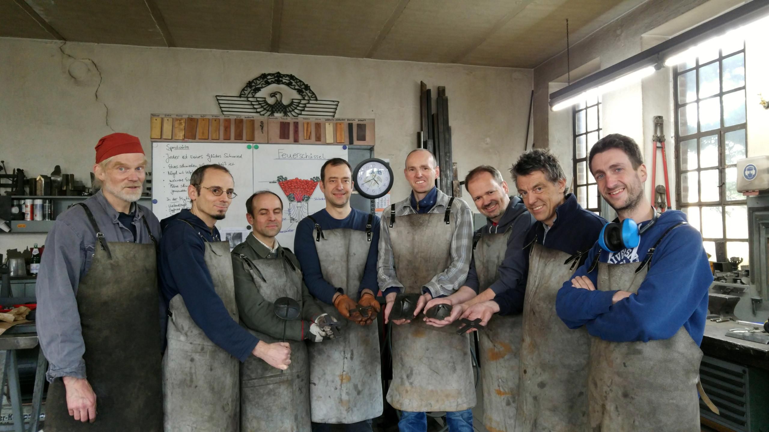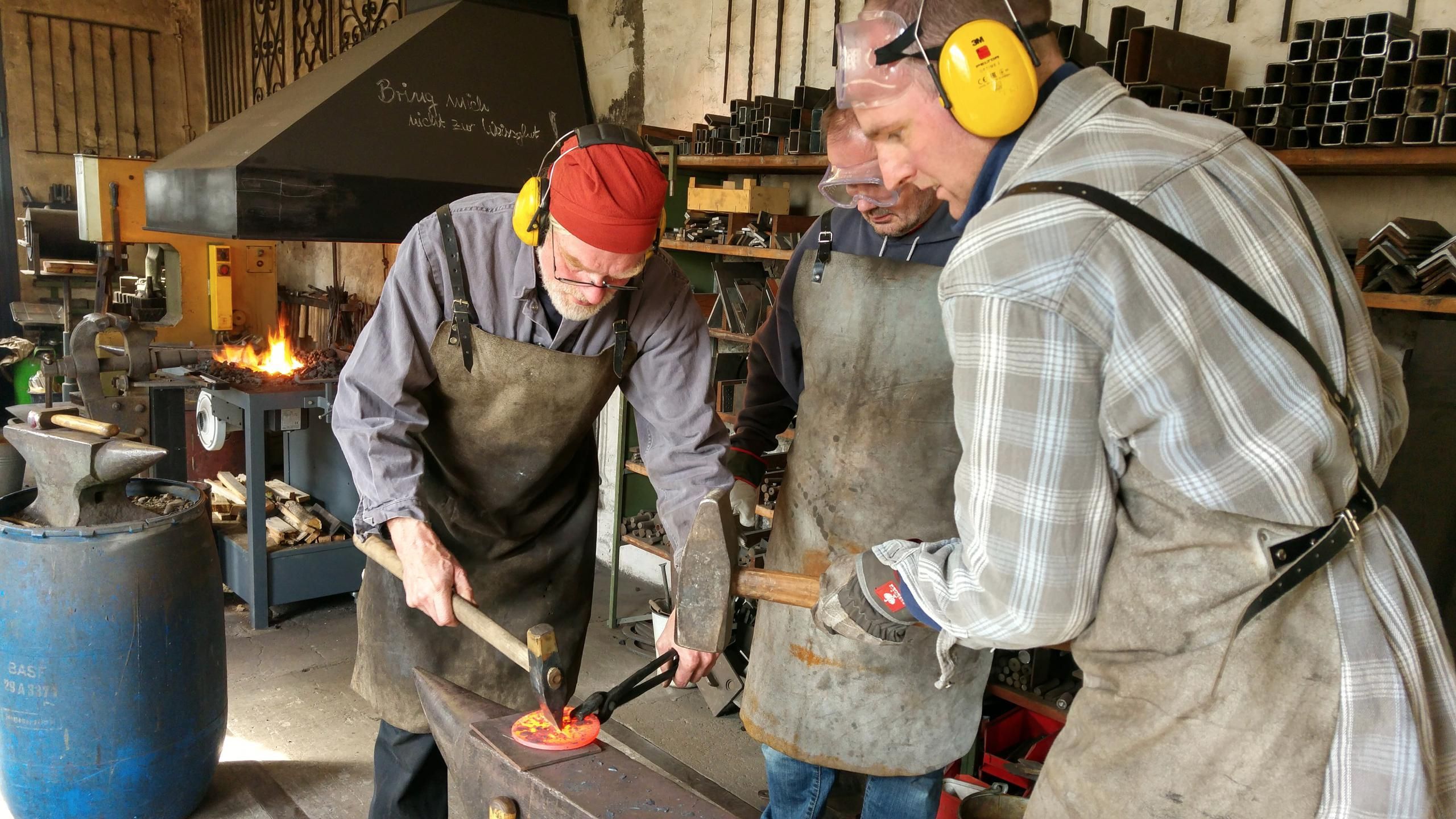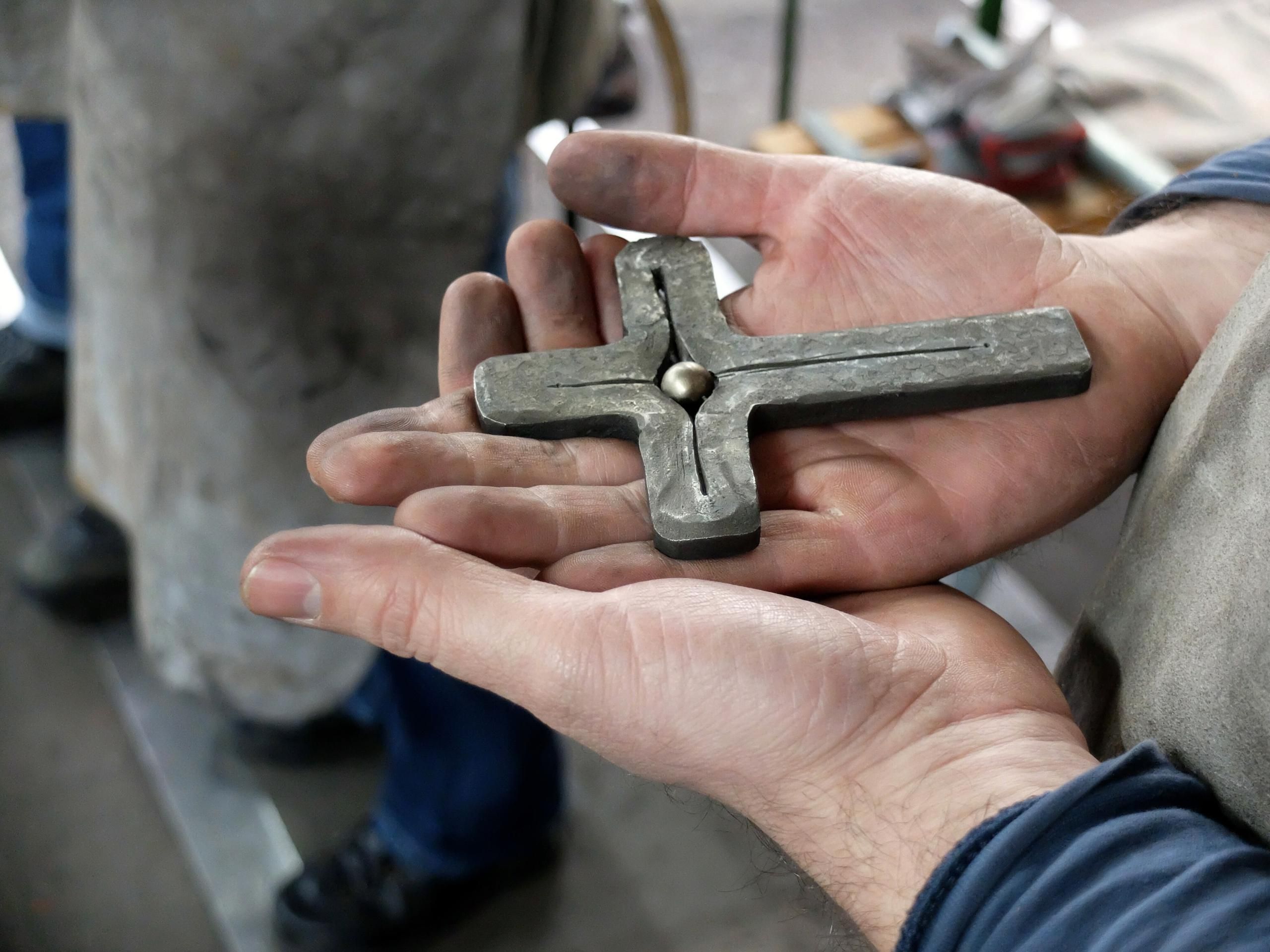 Film des Domradios. Väter schmieden ein Kreuz für ihre Erstkommunionkinder.